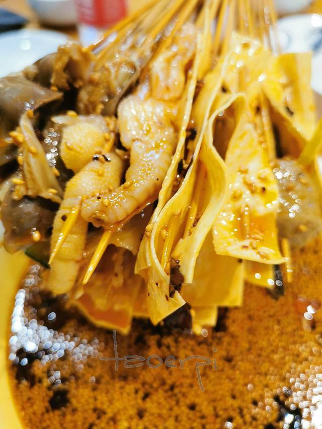 从张公桥的竹溪河到岷江边的滨江路,分开到关帝庙街南边的里仁街一段和演武街一段,布满了极具乐山特色的美食,跷脚牛肉、油炸串串、麻辣烫、钵钵鸡,隔几步的甜皮鸭店,基本聚集齐了。进店的大排档,小吃也糅合在一起,不是小门小铺的集合,都是有店面的店的集合。