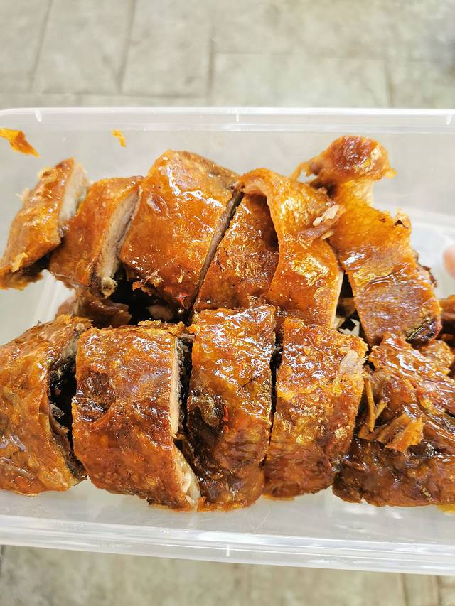 一只鸭子撑起众多的店。洗过糖水澡的油烫卤鸭子,头被卡进了腹腔里,油光锃亮,非常饱满的一只一只的。色泽棕红、皮酥略甜、肉质细嫩,比普通的卤鸭子多了甜味,多了酥脆。