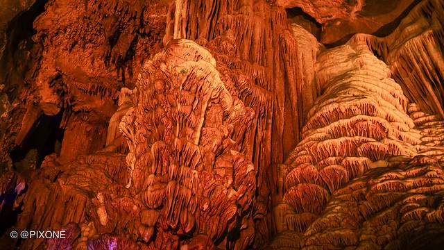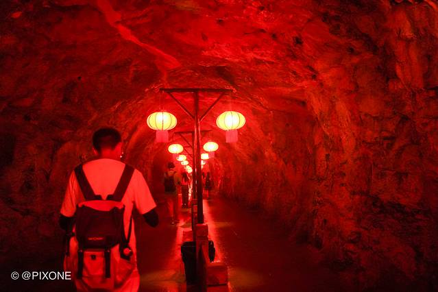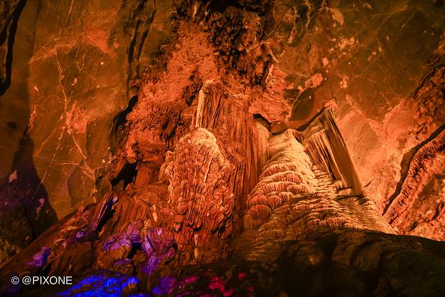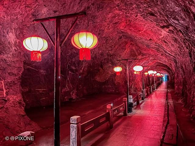 经云梯到达山顶后,就可以看到九霄碧云洞入口了,进入洞口,有一段两三百米的湿漉漉的红灯笼隧道,越往里走,温度就越低,过了隧道,就到了溶洞主景区。