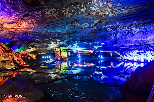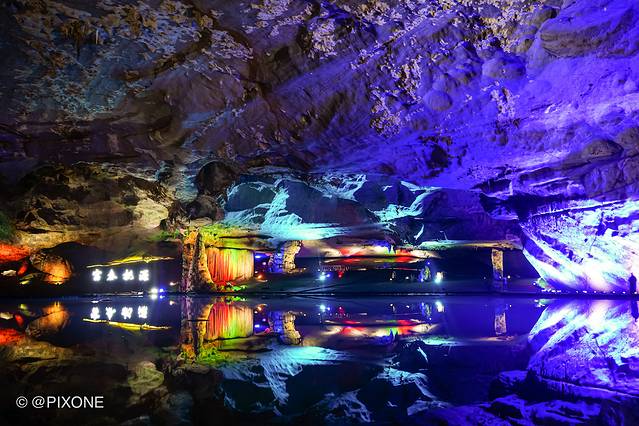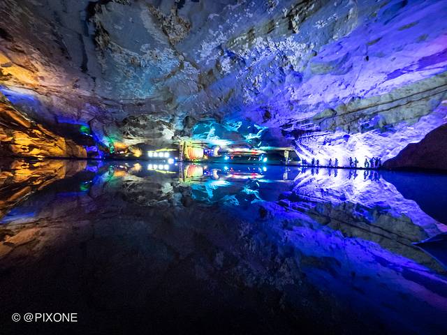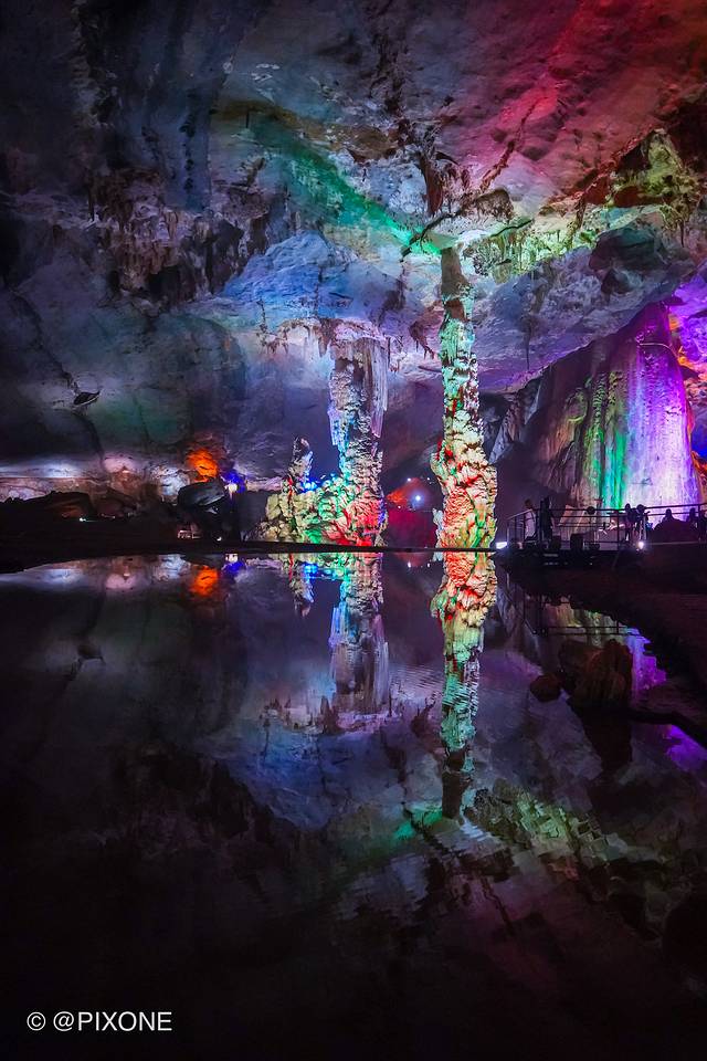 整个洞厅,犹如茶卡盐湖一样,水面倒映着七彩的钟乳石,而且洞顶正好犹如蓝天白云般的奇观,所以到这儿来拍照,出来的照片真的有蓝天白云的效果。