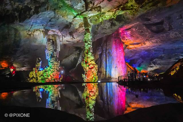 这里是一个篮球场大小的溶洞厅,号称是“亚太第一洞厅”。洞厅地面有一片浅浅的池水,倒映着布满灯光的钟乳石景观。钟乳石的造型千奇百怪,游人可在此尽情想象,赋予它们形象和意义。