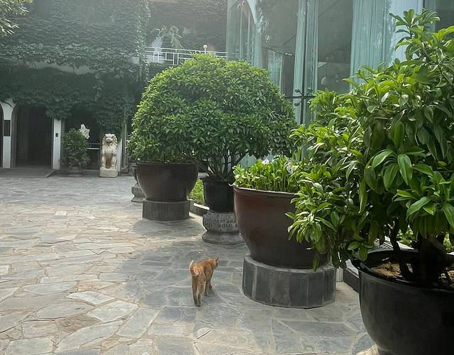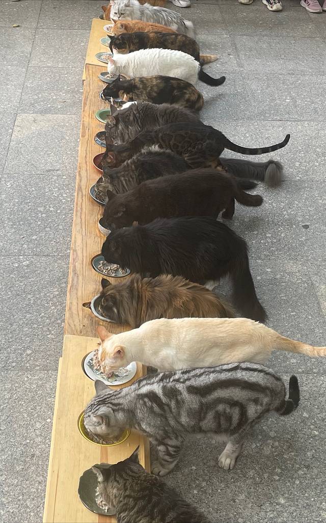 猫猫们真胖呀,正赶上猫猫用餐。工作人员准备好屏风和餐具,一下子满满的仪式感。一个肥过一个的猫猫乖乖排成一排用餐。院子里游荡着一只瘦瘦的猫猫,看来是个不爱吃饭的宝宝,工作人员也不勉强他。猫猫们无疑是博物馆的顶级网红,怎么看也看不够。