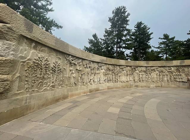 小路的尽头是小广场,中间一颗挂满红飘带的许愿树,两侧是龙门石窟被盗卖到美国的“帝王礼佛图”和“帝后礼佛图”的仿制品。不明白为什么做这个,有点令人费解。