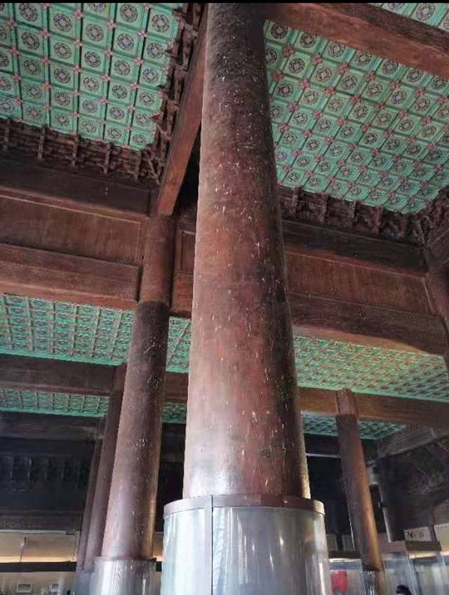 榫卯结构不仅稳固而且美观,着迷了很久的斗拱美得很张扬,没有过多的修缮,粗壮的木头咬合的天衣无缝,渐有风化剥蚀更显岁月感。其实仍然很想不通这个900多年的木质结构是怎么保存这么好的,要知道紫禁城不过600年还是几经维护的。