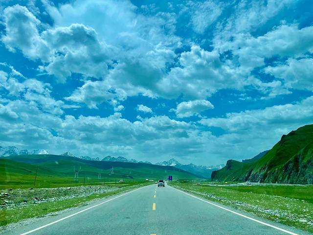 沿途的风景大草原看起来宽广辽阔,开着车在中间大马路上驰骋别提有多爽了。向着雪山的地方前行,我们还会回到巴音布鲁克去看日出,先把独库公路自驾完再回来。