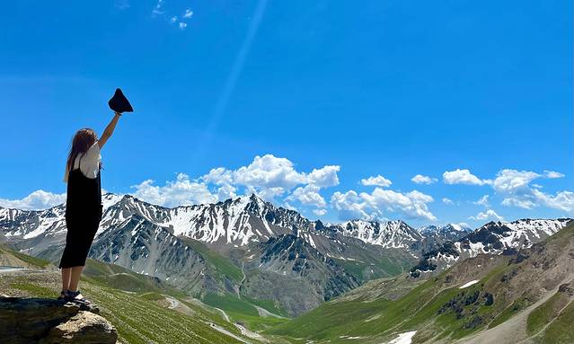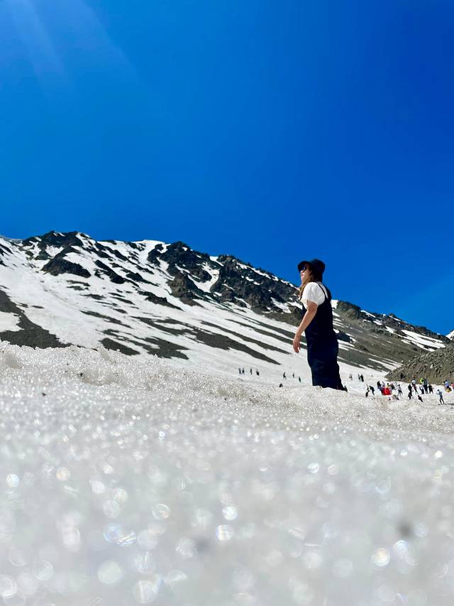 从天瀑出发继续往上走大概15公里左右,均是蜿蜒的山路,提示大家谨慎驾驶,路程半个小时到达独库公路北段最高点:哈希勒根冰达坂,海拔高度3390米,并且周围都是雪,虽说这里的紫外线很强,但是气温很低,此刻你的羽绒服就可以隆重登场了,套上羽绒服就可以安心的在这里休息调整,滑雪打雪仗,补充能量,旁边还有卖烤串的。