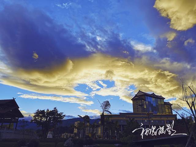 公路旁,面向西边,当地办公大楼一幕,晚霞染黄一边天。