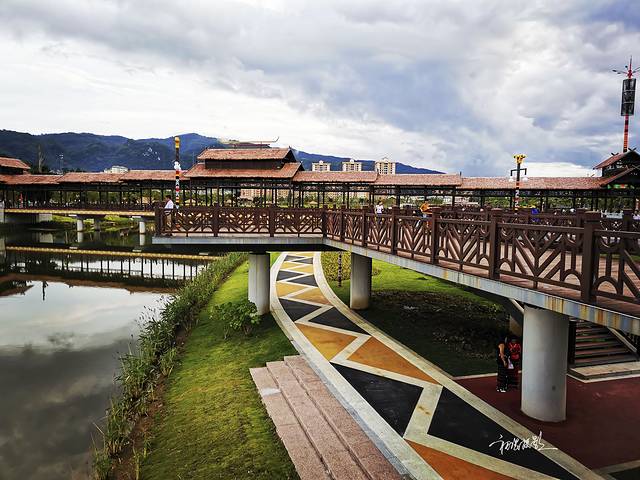 沧源葫芦湖桥头一角,日落前的一幕,阳光洒在茅草屋上,湖面倒立出倒影。