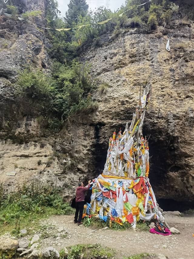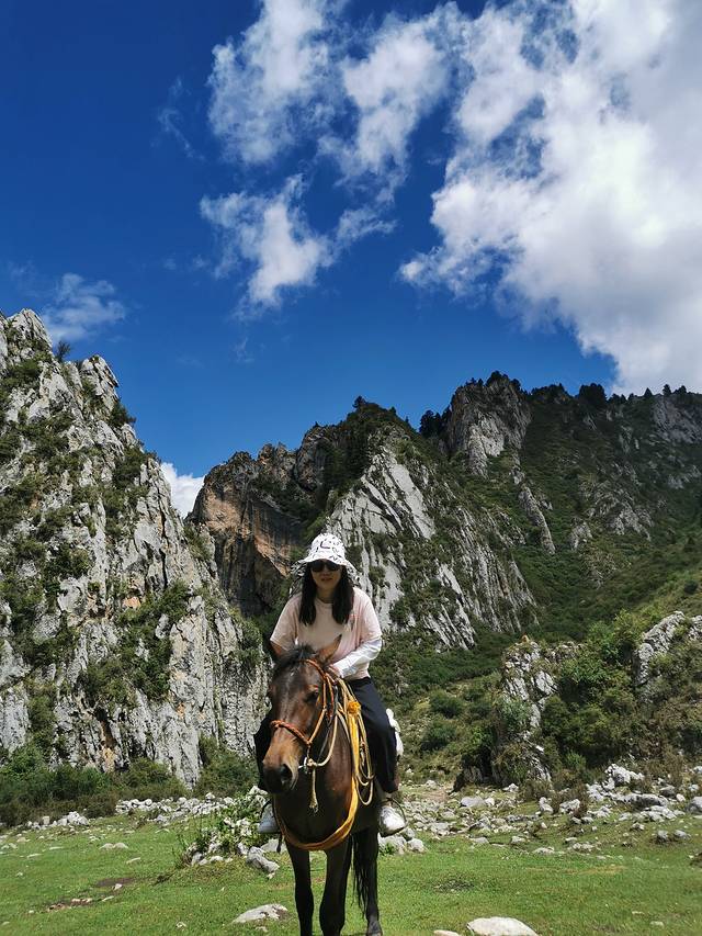 进入峡谷映入眼帘的就是不远处的仙女洞。在洞外就听到藏族同胞祈福的歌声。听到每位进入的人都在唱歌,我和闺蜜顿时不敢进入洞内。生怕不懂规矩,亵渎了当地人民的信仰。继续沿溪边逆流而上,走到碎石出溪水的地方,继续向前就都是崎岖的碎石路了,当地村民积极的询问我们是否要骑马去更深处的草坪。来回预计40分钟,收费100元。还价到80元成行。经过一路颠簸骑行,草坪风景确实还不错,可惜时间紧迫,只拍了几张照就返程了。午饭后向着九曲黄河第一湾进发。