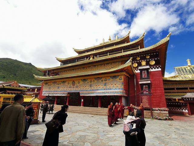 听司机王师傅的介绍,郎木寺乡有两个寺庙,我们选择了有活佛真身的格尔底寺院,且旁边就是纳摩大峡谷。建筑与风景都非常怡人。峡谷石缝中流淌出的溪水清澈见底,清凉舒适,进入峡谷前的草地上小溪流过,很多藏族同胞在露营小憩,小朋友们打着赤脚草地、溪中嬉笑玩闹,画卷般令人神往!