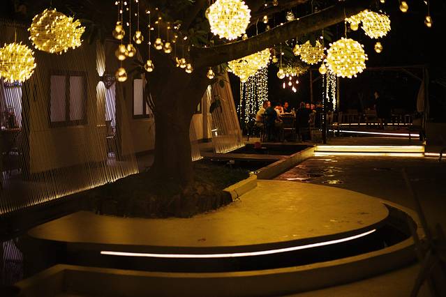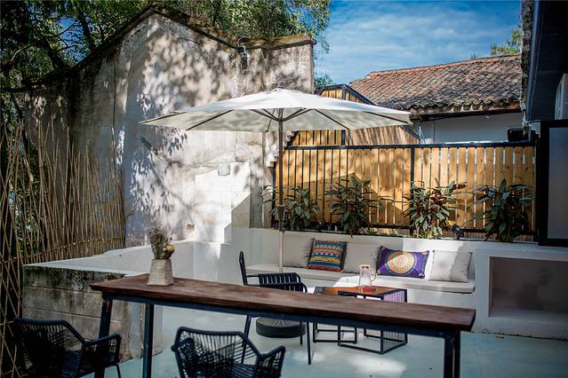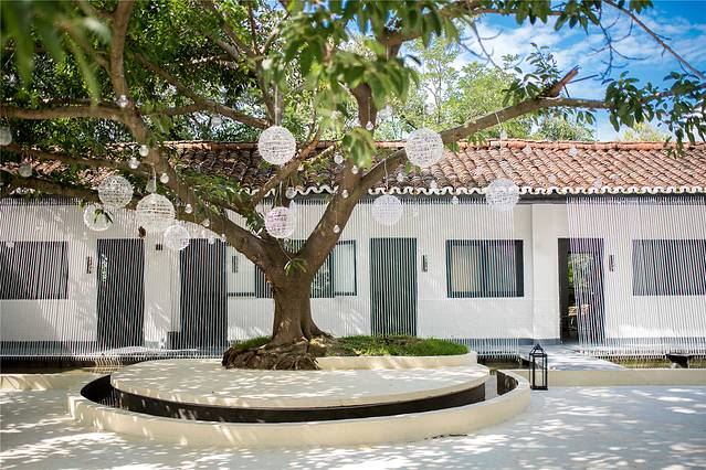 小院中间有棵古树,蜿蜒伸展,活得恣意洒脱。徐莉很喜欢它,并在装修时刻意保留了下来,并挂上白色的羽毛灯作为点缀,与周围环境交相呼应。白天,它用茂盛的枝干和树叶,为小院带来绿意和凉爽,夜晚,它像伟岸的男子,守护着小院的旖旎情调。