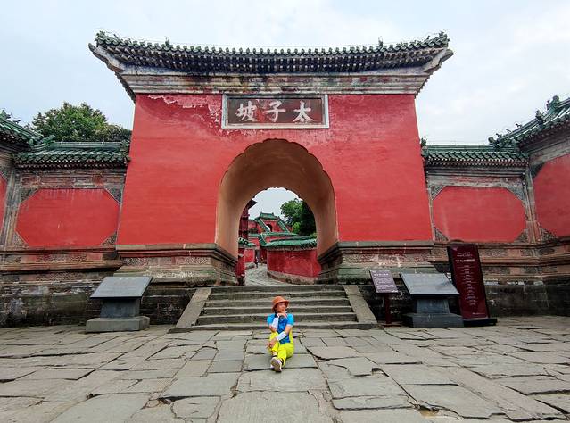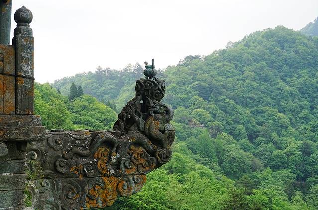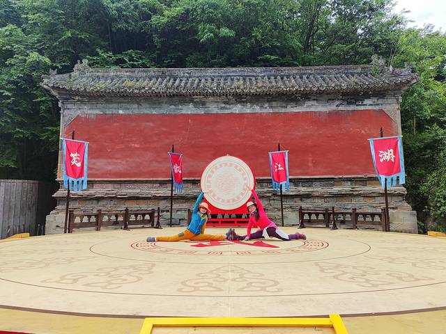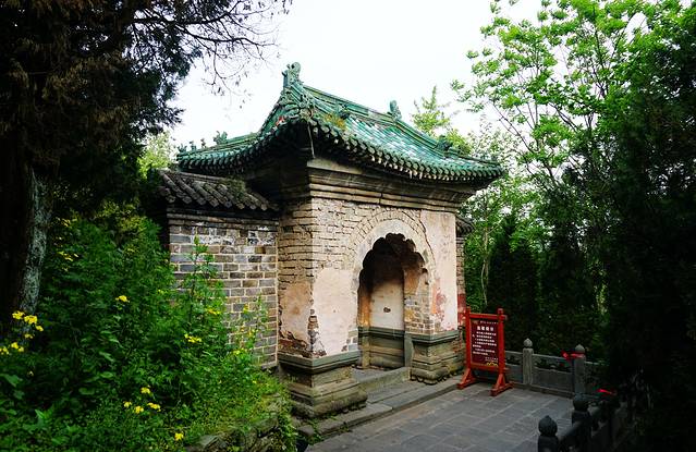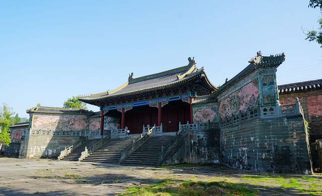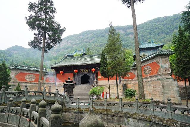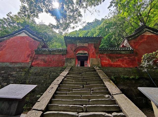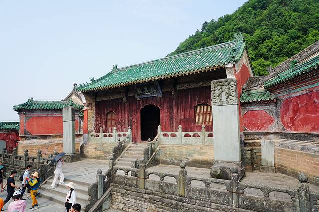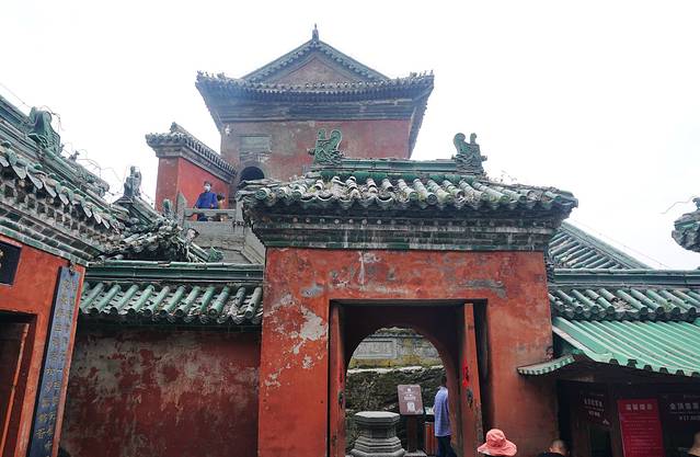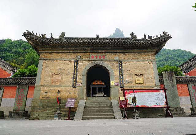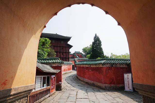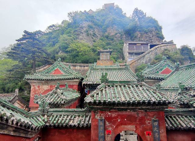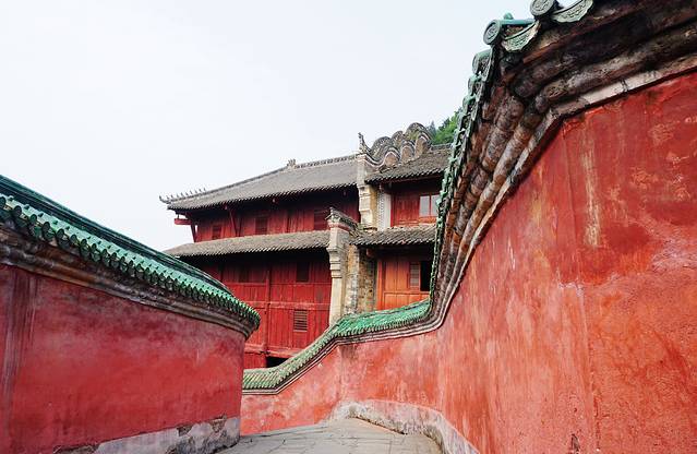 走进山门,古道上是一条依山势而建蜿蜒起伏的砖结构夹墙复道,脊饰绿琉璃瓦,名为“九曲黄河墙”。九曲黄河墙中的“九”作为“纯阳之数”的代名词,属乾元之九,体现了道教的思想。高大的红墙,配上绿色琉璃瓦顶,犹如两条巨龙盘旋飞腾。