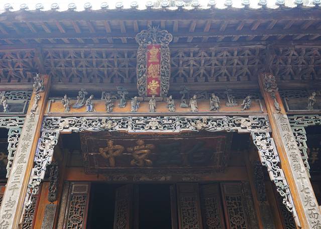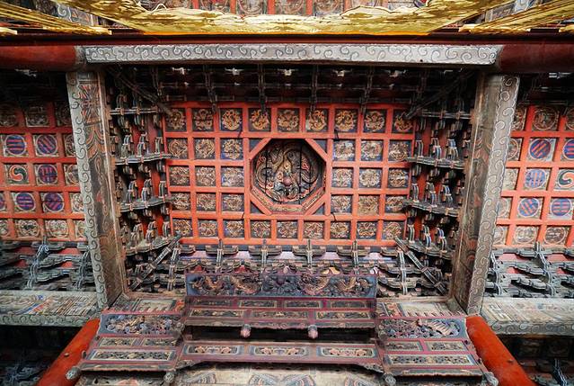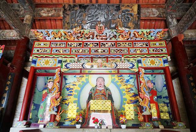 其额枋、斗拱、天花遍施彩绘,藻井浮雕有二龙戏珠,形态生动宛若真物。彩绘使得全殿显得光彩夺目、富丽堂皇。