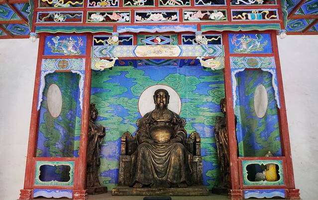 第二重院落崇台上就是复真观大殿玄帝殿,又名“祖师殿”,是复真观的主体建筑。殿堂崇台拱拥、翠瓦朱墙、涂彩饰金,雕梁画栋。大殿内供奉着真武神像和金童玉女侍从,这组巨大的塑像为武当山全山最大的彩绘木雕像,虽历经600年,仍色彩如新。