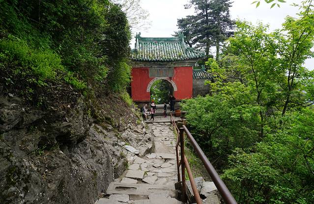武当山金顶的古神道上,建有三座天门,额书一天门、二天门、三天门。三座天门气势恢宏,依次屹立在数千级饰栏石阶之间。上一天门石阶路最长最陡,难度最大,史书记载:早年朝山进香的信士香客,在艰难行进中,看到眼前屹立的高大天门,都要欢呼雀跃,万山回应,经久不息。
