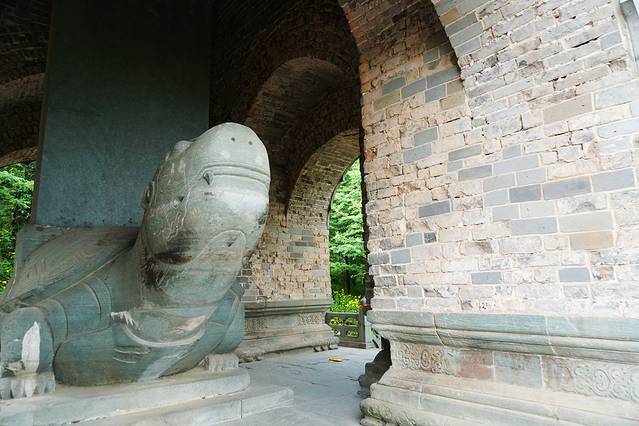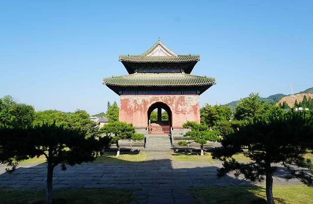进了小天门左边是一座略显沧桑的御碑亭立于高台之上,碑亭为重檐歇山顶式屋顶,琉璃瓦檐角高伸,方形四方各开拱门一孔,下面护栏青苔斑驳。亭内置永乐年间的赑屃驮御碑石碑,石碑上镌刻着永乐皇帝的圣旨。
