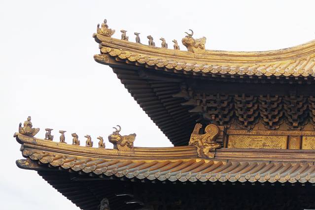 紫霄殿的屋顶全部盖孔雀蓝琉璃瓦,正脊、垂脊等以黄、绿两色为主楼空雕花,装饰丰富,多彩华丽,脊饰有龙凤宝瓶、仙人、天马、海马、狮子等大小鸱吻共61个,这样的建筑作法,在明代代表着皇权的最高等级。