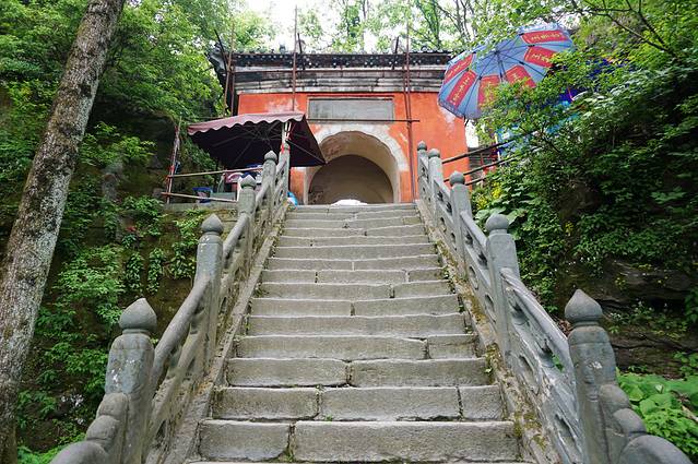 朝天宫这里上金顶的路有分岔,分为明代古道和清代古道两条路到达金顶。明代古道阶梯多,路难走,但重要景点三道天门、会仙桥、朝圣门都在这一路。清代古道相对平坦,但没什么景点。我们自然选择时代更久远的明古道继续上金顶。