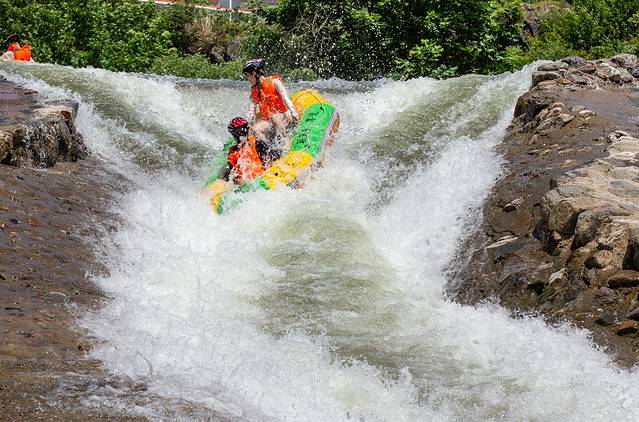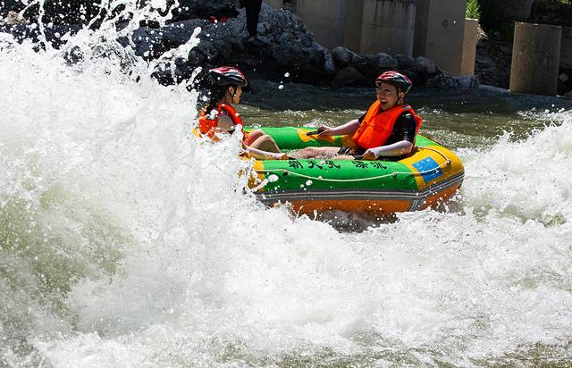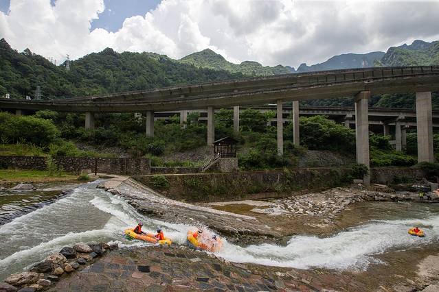 朝天吼漂流落差大,急流多,整个过程精彩刺激,险象环生,就像乘坐水上过山车,不仅水拍浪打,有时候赶上巧劲还可能翻船,景区的安全人员训练有素,眼疾手快,一看到险情马上赶上去,把落水者扶上橡皮艇。其实翻船落水并不可怕,镇定下来站稳后才发现,水不过齐腰深。虽然安全措施做得很到位,但也要做好充分的准备,随身东西装好,放牢固,保护好眼镜、手机,一路上丢鞋、掉桨的情况还是很常见的。