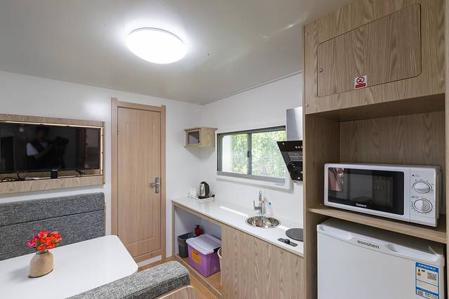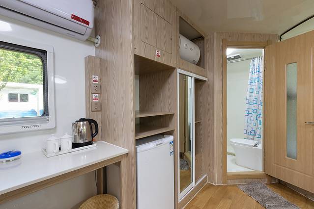 朝天吼房车露营基地共有四十多台房车,低密度分布提供舒适的空间距离,房车分为单间和标间两种:单间里面有一张1.5m的大床房和一个1m的上下铺;标间是4个1m的单人床,可以住两家人。房车里面有冰箱、电磁炉、微波炉,外面有遮阳伞,有桌子、沙发、卫生间、淋浴间,洗手池,且洗手池下面还有插座,非常方便,住在里面温馨舒适,有一种回家的感觉。
