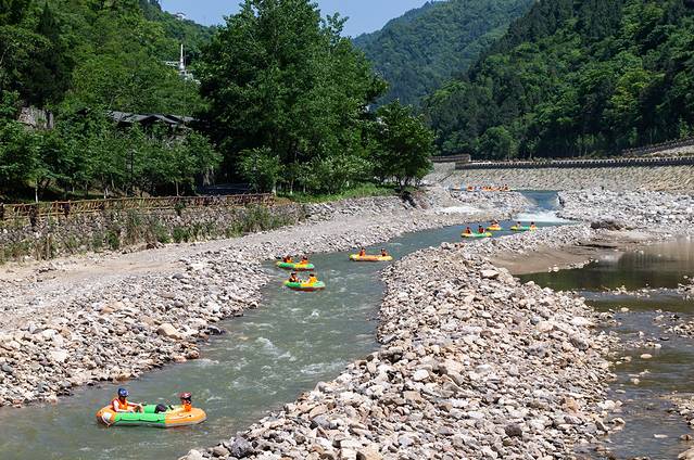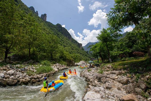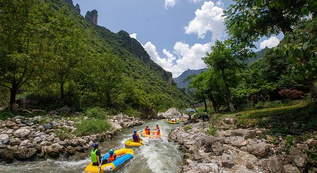 急流过后也有平静的河段,风平浪静之时,汹涌澎湃的河水变成温柔舒缓的潺潺溪流,看两岸奇峰怪石,层林叠翠。一路经过卧佛山、八缎锦、将军柱等十多处景点,是一条名副其实的风景长廊。