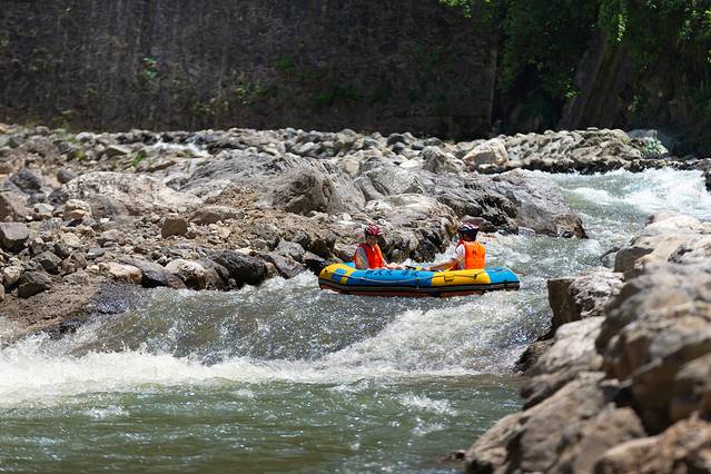 朝天吼景区距离宜昌市100公里,一个多小时车程就能到达,下高速出口就到景区,交通十分方便。一下车,小伙伴就已经迫不及待得跃跃欲试了。换好衣服,领取装备,穿好救生衣,戴上头盔,绑上护膝,一行人来到河边,排队登船。每个橡皮艇乘坐两人,坐好之后,工作人员一个顺水推舟,我们就出发了。