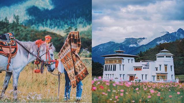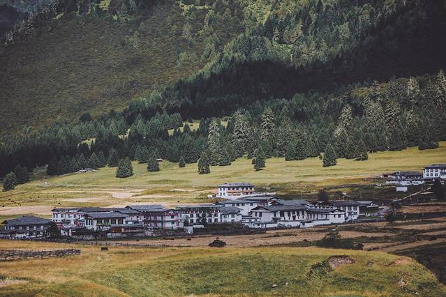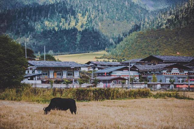 事实上,这个村子藏语的含义就是“坡上的村庄”。而围绕着坡四周,就是在高山田园牧场,整体看过去就是恬静祥和的氛围。