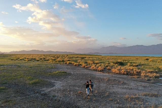 ●下车一直往湖边走,背后是夕阳,前方是诗和远方,潋滟波光水映山,人入此景便觉仙。和媳妇儿拍了一会风景照,把无人机拿出来取了景,留恋这里的天高云淡,景美情真。