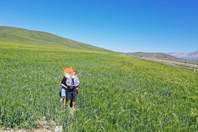 ●过了【花海鸳鸯】6公里左右,路的右边有一条通往村庄的的路,我和媳妇儿都被路右侧一大片青稞田与起伏的山峦吸引。这个地方能停车,麦浪起伏,很适合拍照。