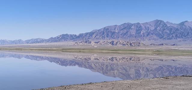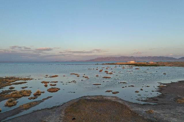 ●往德令哈方向,远处的半岛型的岸边,有牧民居住,停靠有车辆,应该是牧家乐,消费的话,能把车开到湖边上,但是进出口不了解在哪。靠近水边,我们前往的那出,刚好有一条40cm宽的硬质沙路,把湖分割出了一个小池塘,这样能很好的拍摄出倒影。拍了一组照片,把无人机放出来收集了一些素材,满意的走了。