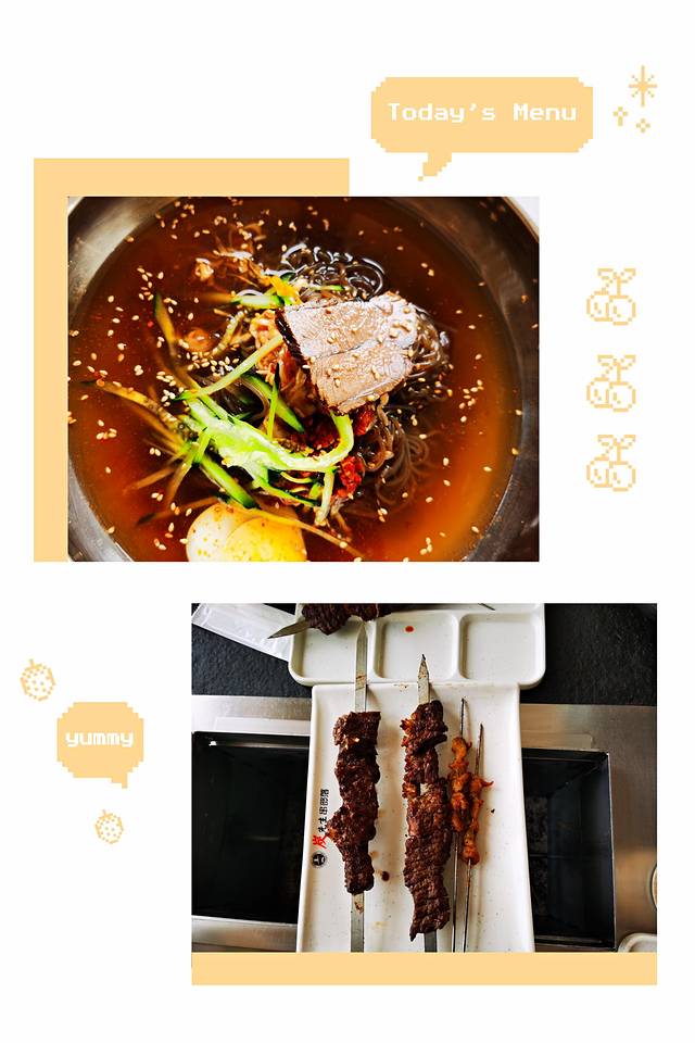 跑了一天已经是下午2点多了,让司机给我们推荐了一家吃冷面的地方,烤的那个小羊肉串又焦又脆很好吃,大牛肉串吃着过瘾,就是有点费牙。当地人吃牛肉很厉害,他们的牛都是在草甸子上自由生长的,喝的是天然的矿泉水,吃的是原生态的草,所以它们的肉也受当地人推崇