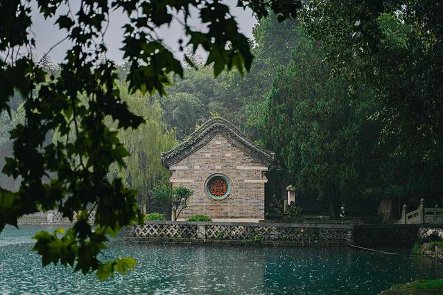 也许是因为太过小众,又或许是因为雨下不停,整个老龙湾游客罕至。穿过不大的正门进入,一片宽阔的湖面豁然开朗。与十笏园由人工精心设计截然不同的是,老龙湾里所呈现的都是自然山水。其中湖水面积多达8万平方米,在烟雨之中碧波荡漾,颇有几分小西湖的姿色。