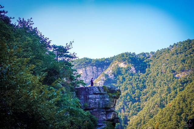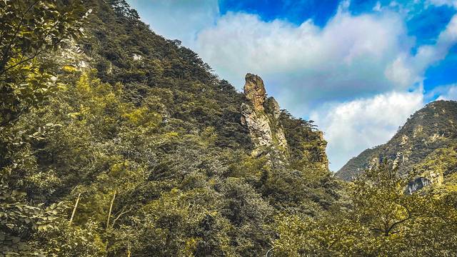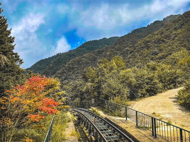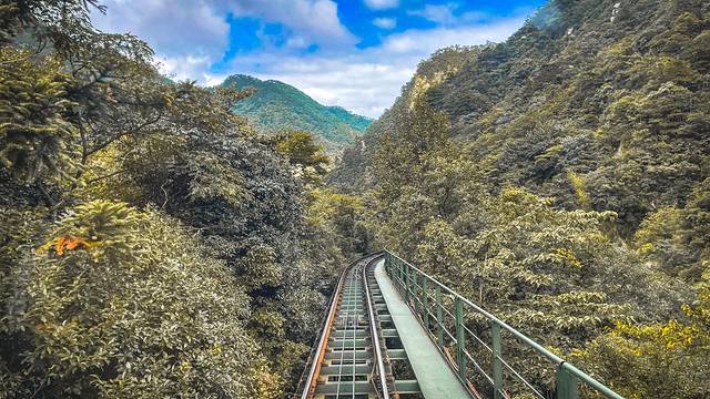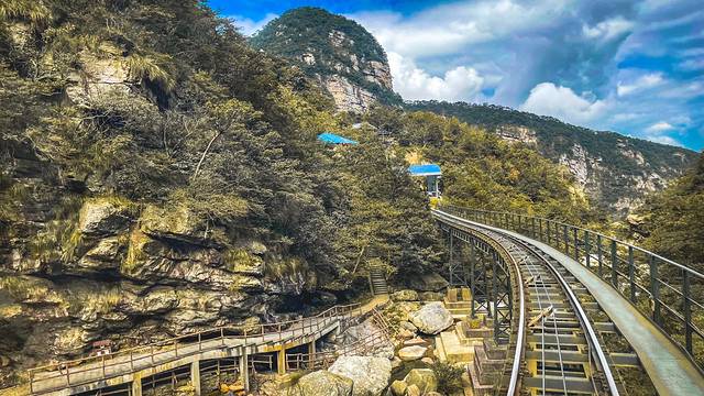 一路上风光旖旎,仿佛在森林中穿行,如果幸运的话,站在前面靠窗的位置,视野开阔,当轨道变宽,能看到对面开来的车在此相交汇,周围植被茂密,溪水潺潺,怪石嶙峋,细心的你还能找到一处形似“李白”的石头,这是当地人发现的,至今还没有被正式命名,无论是巧合还是冥冥之中早有注定,当年李白未曾到过的三叠泉,四季更迭,如今我们能仰望这座形似大诗人的石头,何尝不是一件幸事呢!