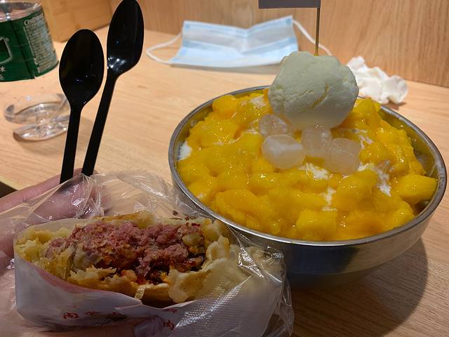 天马牛肉饼。牛肉饼的肉很真实,不是肉馅,就是肉粒哦,饼皮比肉好吃,油脆的。芒果冰就一般般了。