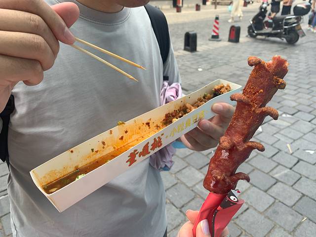 大香肠居然是炸腊肠。臭豆腐好像没有黑色经典的好吃,但是也比外地的强。这个长条盒子真的是无法理解,烫手还容易洒