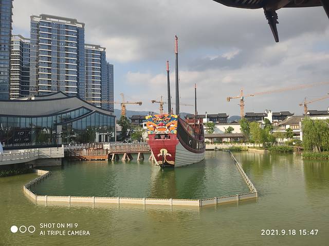 穿过了大榕树就到了迎福桥,在迎福桥上往左看,就是水镇的大福船,据说是按传统工艺人工打造的大船,搭配上八仙过海图,十分大气雄伟。