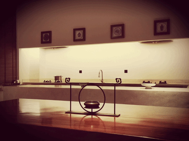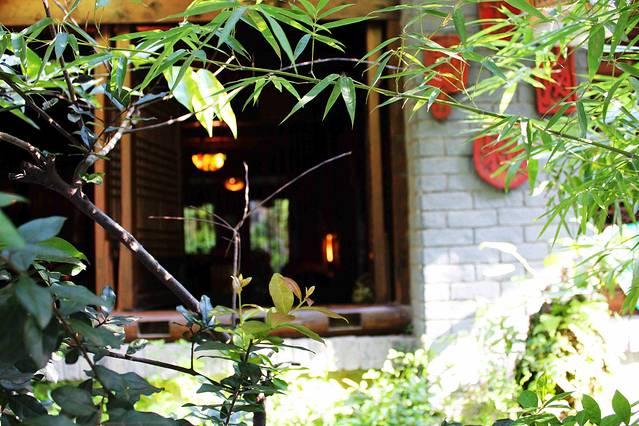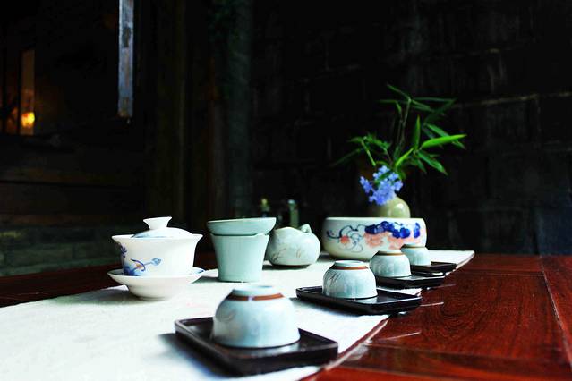走进大门,几块斑驳的木门,一副老旧的对联,古朴清幽感迎面而来,两间老屋排列,青砖绿瓦,庭前一副老石磨子、两个半弧太平石缸,厅堂内老旧家具陈列,后有露天庭院,三两株芭蕉探出墙头,为静谧的茶社增添了无限韵味和生机。