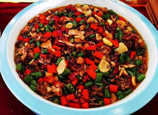 双椒兔,青红辣椒的点缀,让整道菜颜值表现不俗,花椒和辣椒的结合,又将麻辣鲜香的味道瞬间逼了出来,兔子肉质细嫩,一口咬下去麻辣爽口,鲜香四溢,令人赞不绝口。