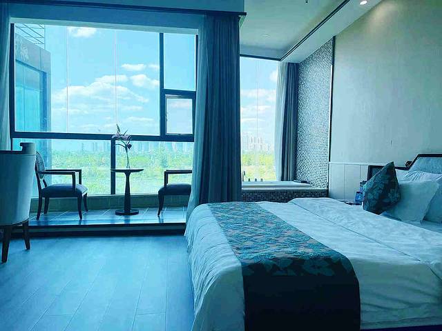 传统东方底蕴与简约的现代利落完美融合在一起,营造了清新、放松的自我空间。270度观景台,推窗即可见到的观音湖江景,视野开阔,尤其是夜晚的江景,更是美得如痴如醉。