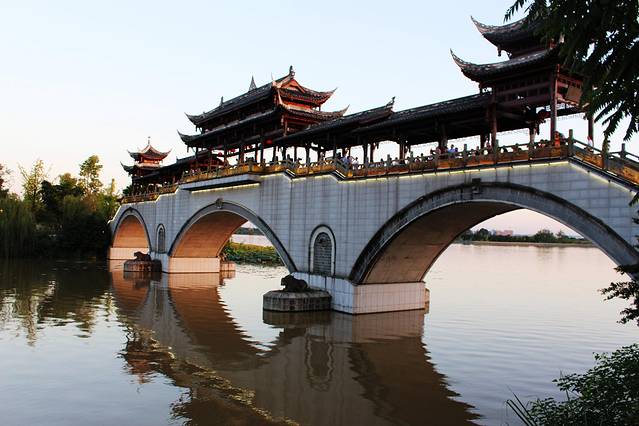“湖边有水月,心中无红尘,”这句话大概说的是遂宁仁里水乡吧。仁里水乡新建的莲里公园,有一座望月廊桥,因在同一处能望见两处不同的月亮而得名。