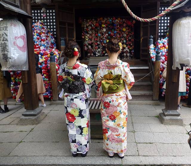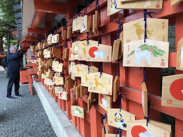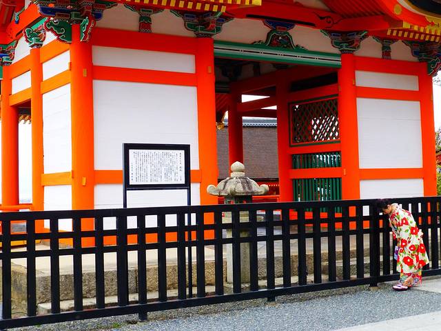 位于京都南部的稻荷山山麓,历史悠久。这里供奉着保佑商业繁荣、五谷丰收的农业之神稻荷,香客众多。狐狸被视为神明的使者,因此这里有许多各式各样的狐狸石像,还有狐狸脸形状的绘马(祈愿牌)。伏见稻荷大社除了主建筑物值得一看,还以其后的“千本鸟居”著称。成百上千座朱红色鸟居构成一条到山顶的通道,全程约4公里,步行到山顶来回大约需要2-3个小时。这段路程是京都代表性的风景之一,电影《艺伎回忆录》中,也曾出现过以千本鸟居作为背景的场景。