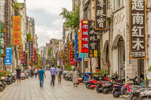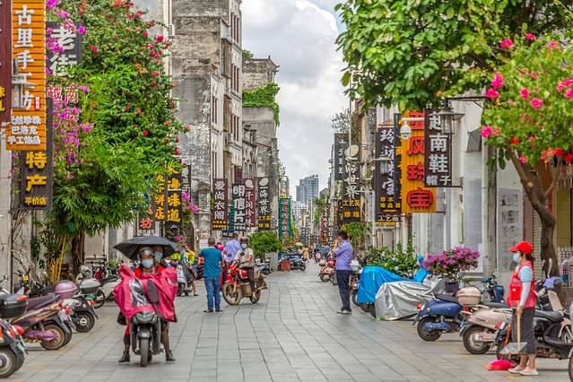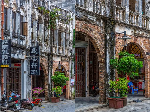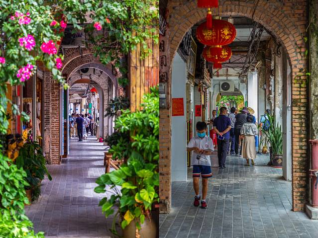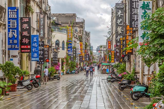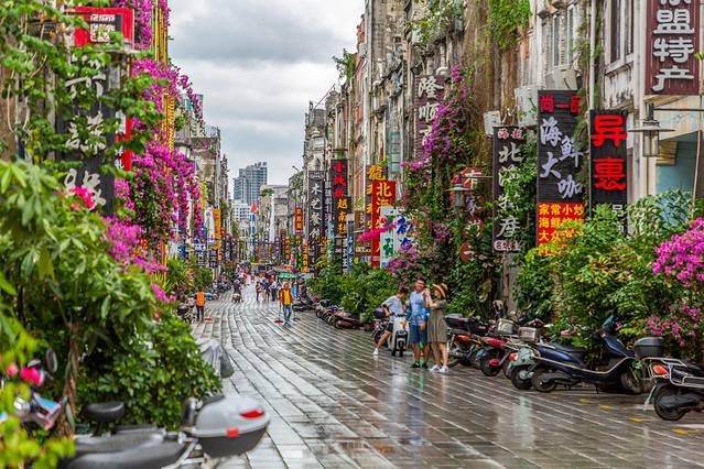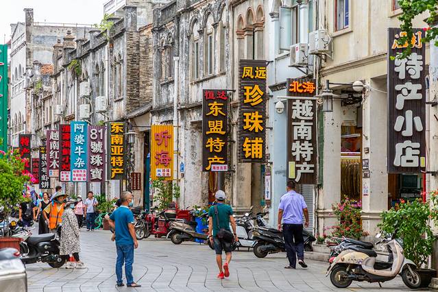 许多城市都有一条属于自己的老街,北海也不例外。北海老街已有近二百年的历史,初建时只有200多米的长度,历史发展到现在总长度已经超过1400米,全是中西合璧的骑楼式建筑。所谓骑楼,是建于南亚、东南亚以及我国南部沿海地区的一种建筑形式,楼房向外伸出遮盖住人行道的部分,可以挡避风雨侵袭和阳光的照射,也逐渐有了浓郁的生活气息。