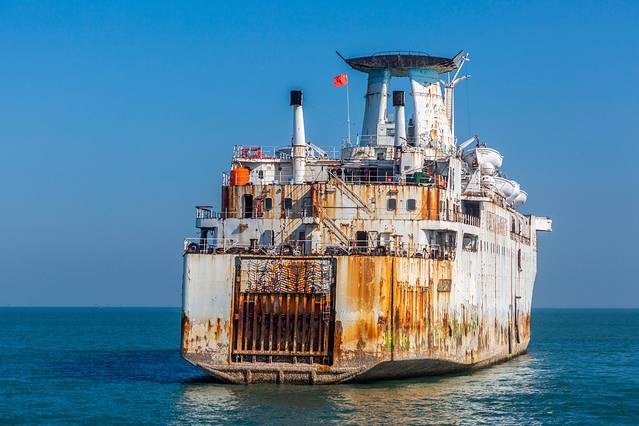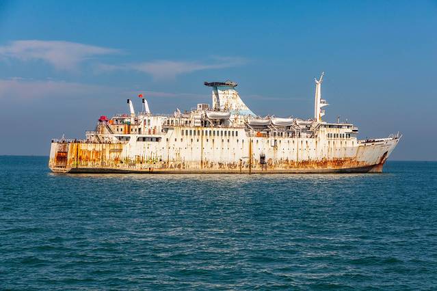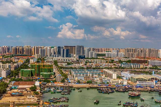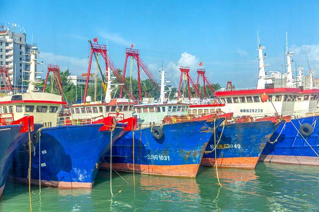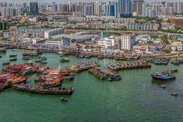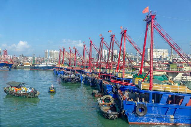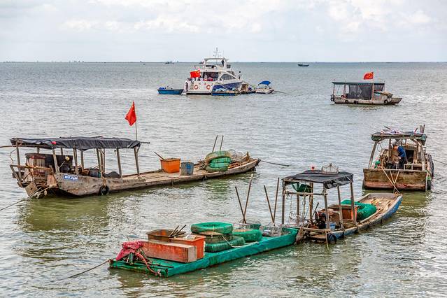 登上开往涠洲岛的客船,在离港码头会有许多渔船引起大家的注意,因为出海时间有时长达数月,这些渔船便会准备远洋出海的物资,在大船的前面会有许多小船在不断地从岸上将物资运送过来。