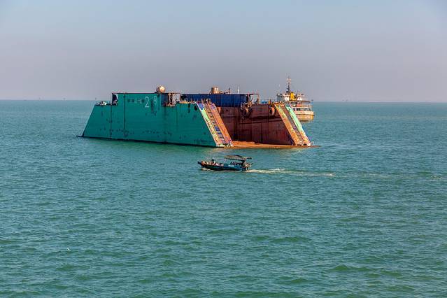 在海洋中行驶的时候会遇见各种船只,不过最引人注意的还是漂浮在海上的船坞,听工作人员讲这些船坞可以漂在海上也可以潜到水里,一般都是用来维修和保养渔船的,在经过其中一个船坞的时候恰好遇到两位工作人员在那里钓鱼,忽然觉得这样的生活也是非常有趣的,想吃海鲜只要自己动手就好。
