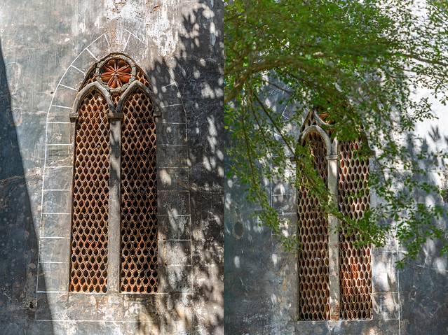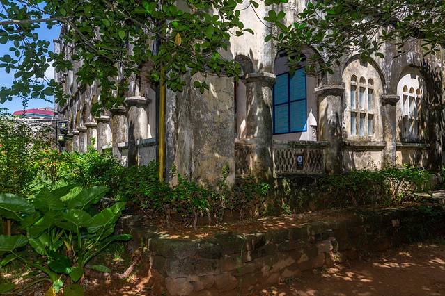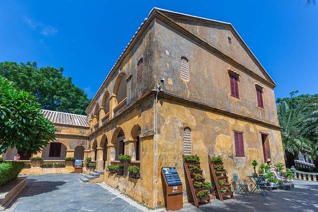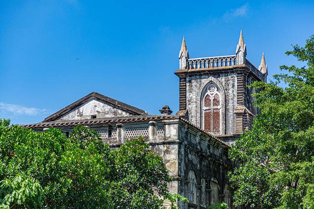 涠洲岛之旅的第一站就是前往盛塘天主教堂,始建于1853年,历时10年建成,这是一座典型的文艺复兴时期的法国哥特式建筑,整个建筑群就掩映在葱绿的菠萝蜜和芭蕉林中,显得格外的静谧。
