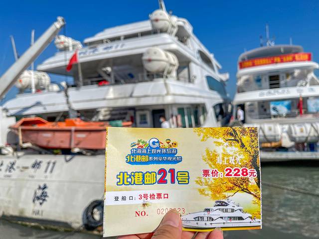 北海环岛游买票和登船都在海角路的北海港客运站,这里的外观看上去有些简陋,走出检票大厅又是一个另外的视觉感受。环岛游览从码头出发,全程大约2小时左右,乘坐的是一艘三层客运游船,在船头感受海风拂面也是难得的舒适。