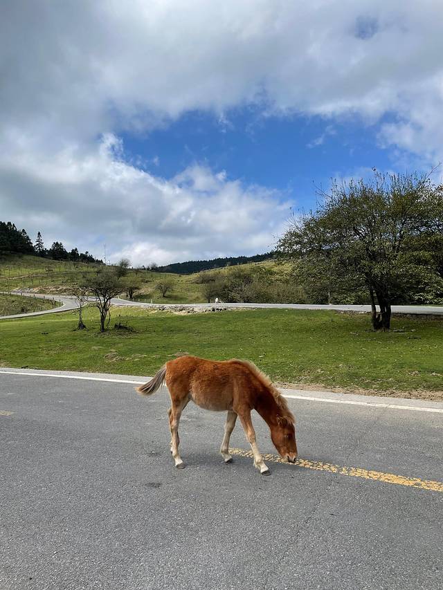 小马驹在路上不知道啃什么,一点都不怕人呢。
