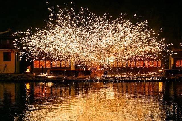 铁水流星落银河,火树银花开满天!传统的非遗项目打铁花,是中国最古老美丽的烟花,在《铁花丹心》里,绚丽震撼的打铁花巧妙地融合在演出里,生动形象的描绘了军民一心修造枪炮的火热场面。