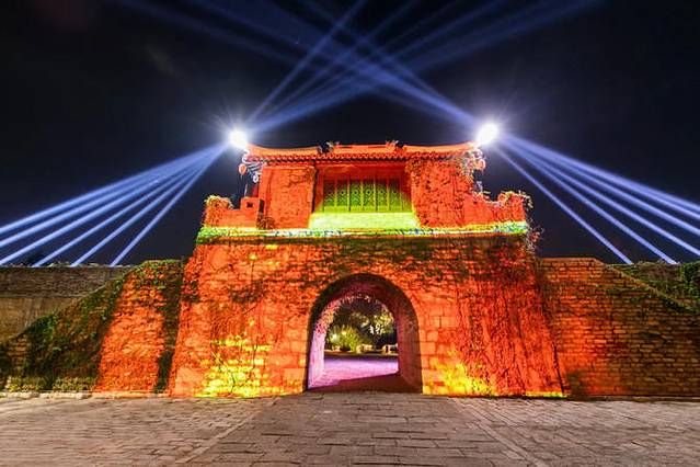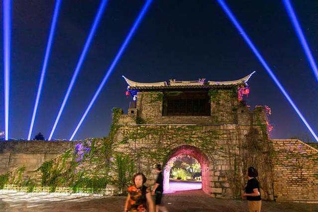以老街城门为幕布,灯光、音响、全息立体投影为笔,刻画谱写出沙家浜的峥嵘岁月和炫丽画卷。