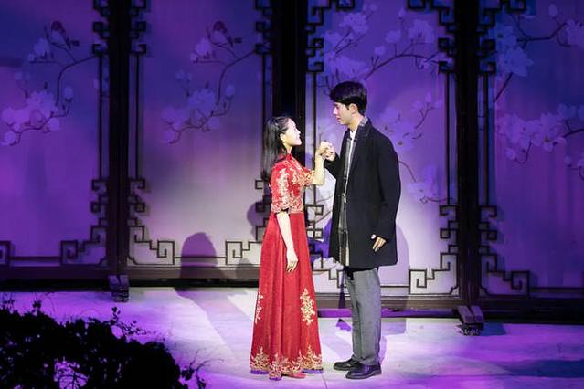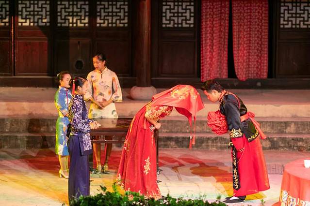 欣赏完让人惊叹不已的《铁花丹心》,回到横泾老街城门楼,夜色下芦苇荡宁静致远,城门内老街却是灯火通明,一场浸入式演出从城楼下诙谐的媒婆开场,引人入胜。